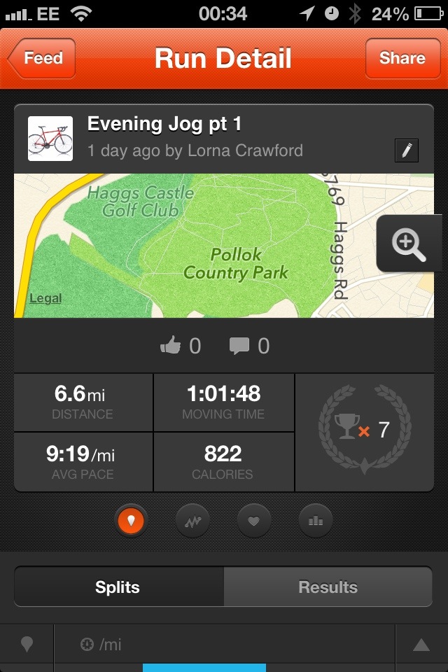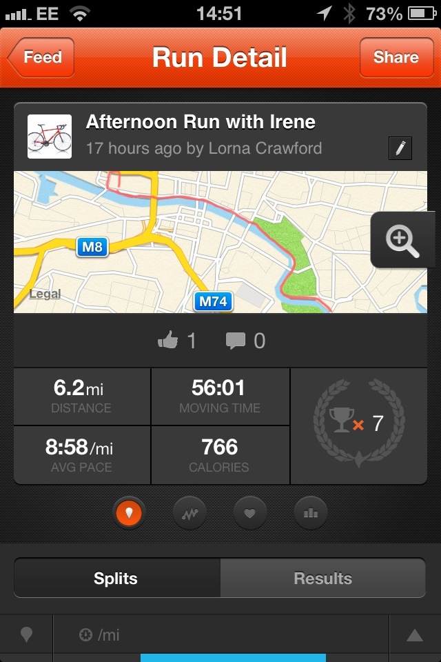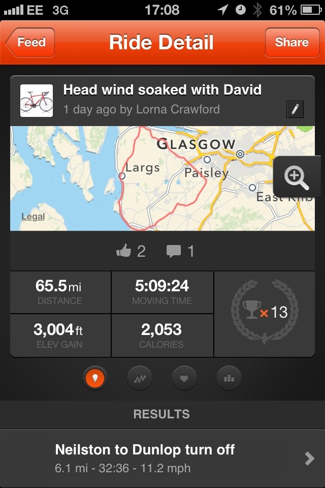 Safely in the door I had a few air punches and a few muted ‘YEAH I’ve done it!’s before stripping off and finding I’d lost my bank card! Showered and dressed I headed back to Tesco car park where I found the bank card! YASSS! Here’s the proof of the ride up to the point where i last checked my phone successfully at Brookfield. The phone died and it missed out the Paisley, Barrhead, Neilston part of my journey so I estimate it was 70 miles in total: