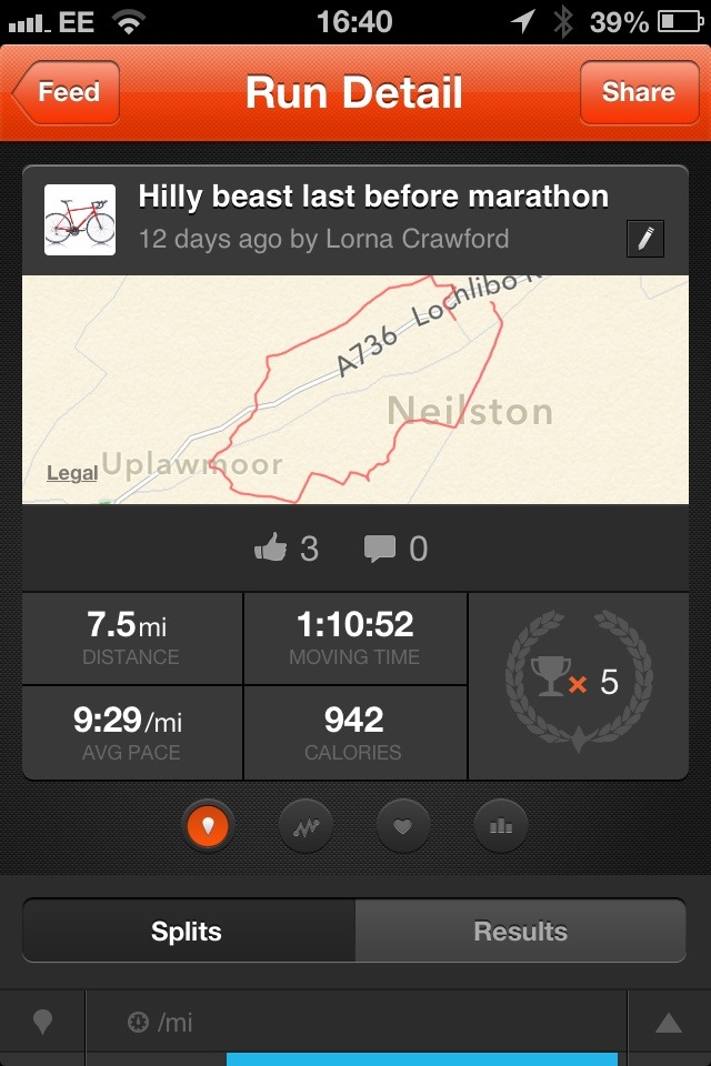 I headed out through the village and down the big hill to past the Mill where I realised I’d not started the app (estimated 0.5 miles)! A quick pause to get Strava going then off we (me & the dogs) went again down to the bottom of the hill and across Lochlibo Road. We took it steady going up the very steep incline for the next mile and past the car park where we’d done our hill training earlier in the week. I found it very tough getting up some of the steeper sections of road but eventually we made it to the top and had a bit of recovery jogging across the undulating top road. I passed a man out running and though ‘he looks like a marathon runner’ only to shock myself that within the next week I too would be a marathon runner!